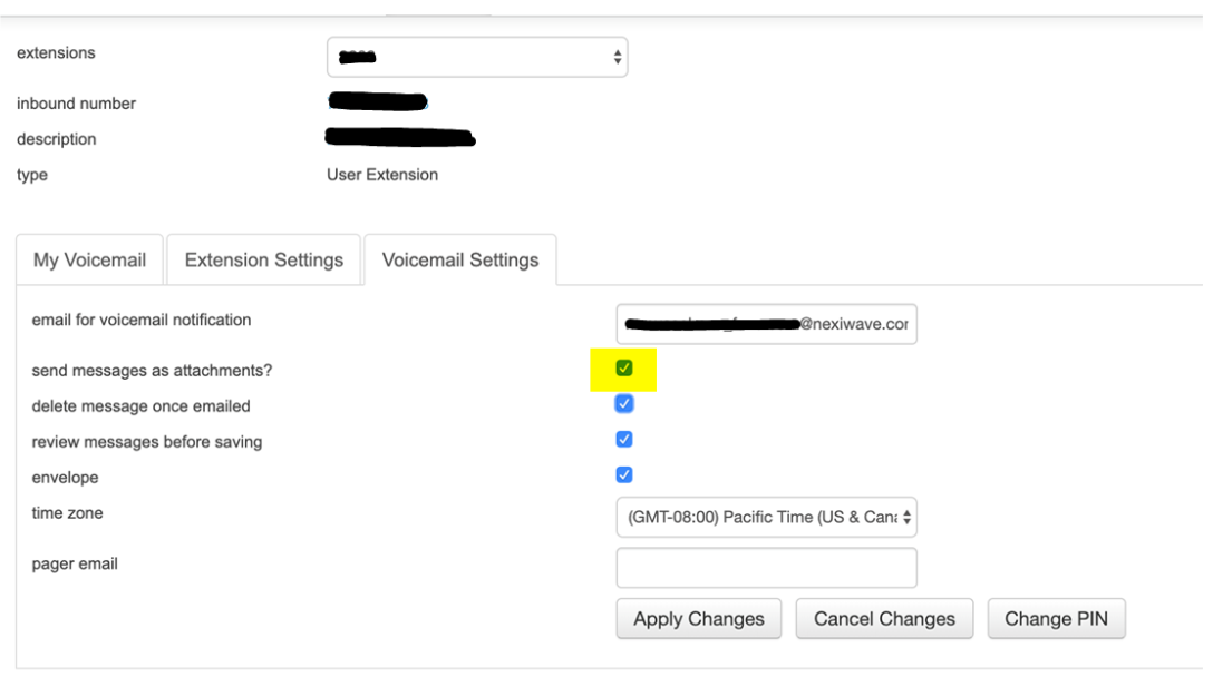 • In the “Voicemail Settings” Tab for Home section, check “send messages as attachments” and add your Nexiwave Voicemail Transcription email address obtained above to the “email for voicemail notification”, then Apply Changes.